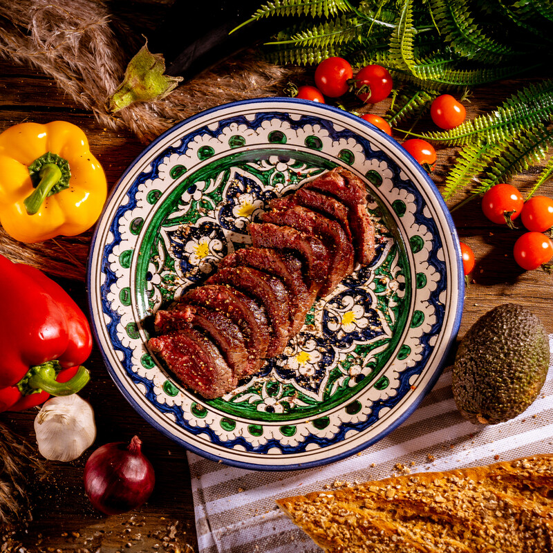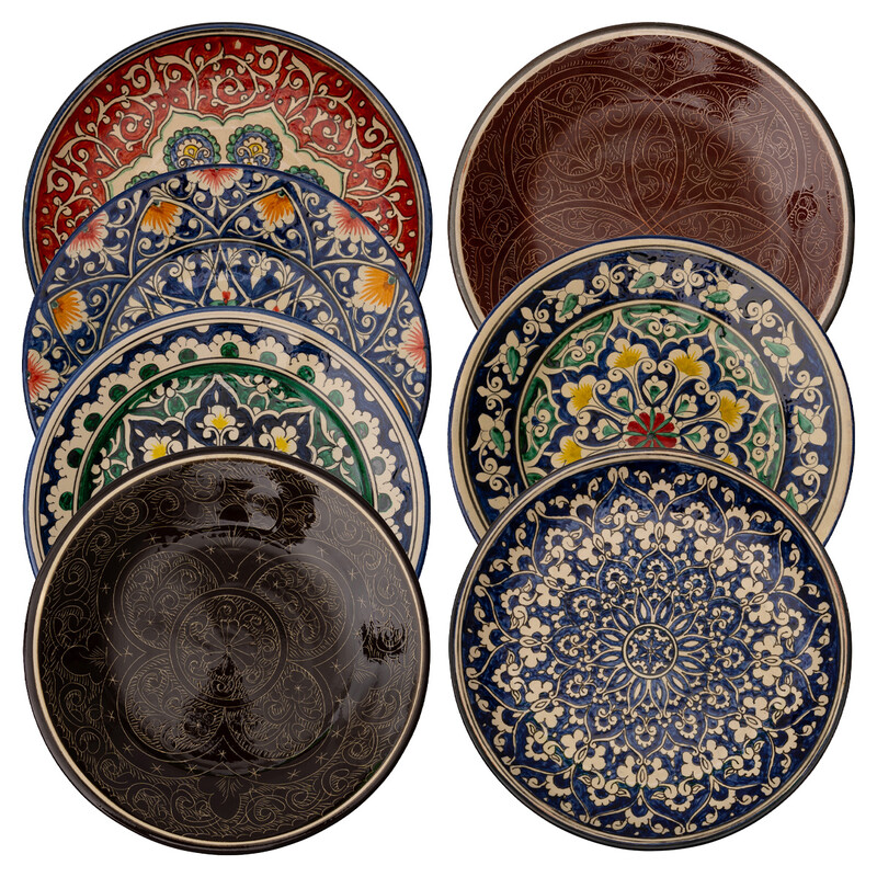Das Design des Tellers erzählt Geschichten und Traditionen der usbekischen Kultur und ist mit lebendigen Farben und kunstvollen Mustern verziert. Jeder Teller ist ein Unikat, da die Farb- und Musterkombinationen zufällig verteilt werden, was seine Individualität betont.